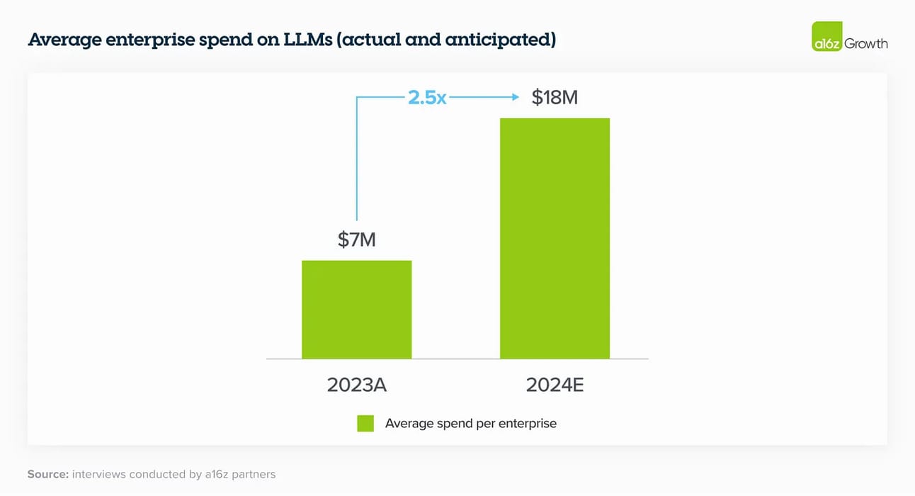 La empresa media de nivel Enterprise tiene previsto gastar 18 millones de dólares en 2024 en LLM e IA Generativa.
