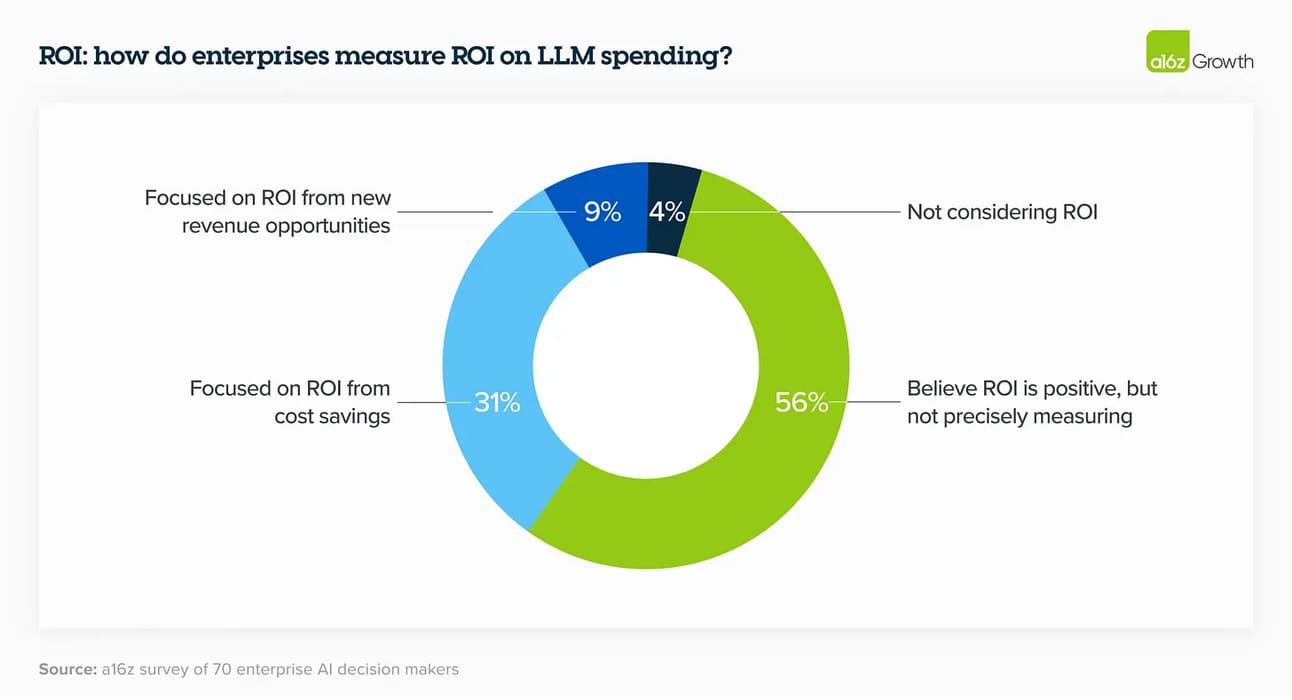 El 56% de las empresas creen que el ROI es positivo en lo que respecta a su implantación en los LLM. Aunque sigue siendo difícil de calcular para la mayoría.