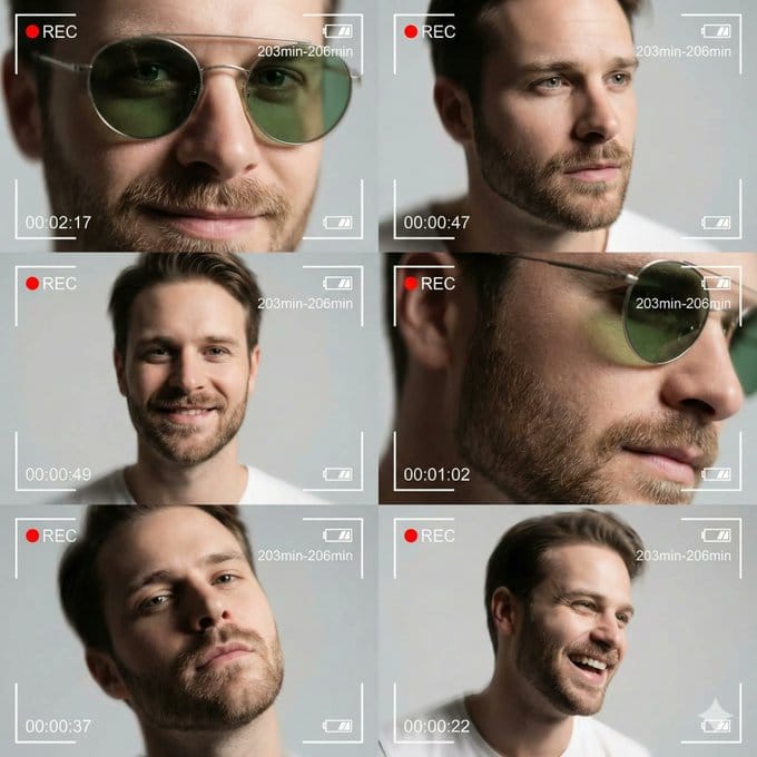 con una estética futurista de la Generación Z, una vibra soñadora y etérea con una ligera sensación de desenfoque tembloroso. Cada encuadre está diseñado como una pantalla de grabación de videocámara digital, con superposiciones en pantalla: icono de batería, símbolo rojo “REC”, temporizador blanco (00:02:17, 00:00:47, 00:00:49, 00:01:02, 00:00:37, 00:00:22) y contador de minutos (203min–206min).