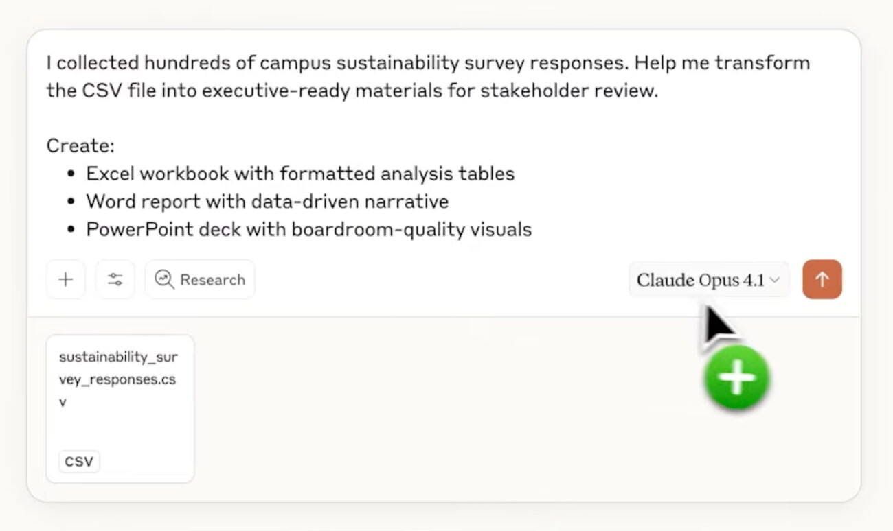 Ejemplo de prompt: He recopilado cientos de respuestas a una encuesta sobre sostenibilidad en el campus. Ayúdame a transformar el archivo CSV en materiales listos para su revisión por parte de los directivos. Crear: libro de Excel con tablas de análisis formateadas, informe de Word con narrativa basada en datos, presentación de PowerPoint con imágenes de calidad para salas de juntasClaude lee conjuntos de datos complejos y produce múltiples resultados coordinados para ti.