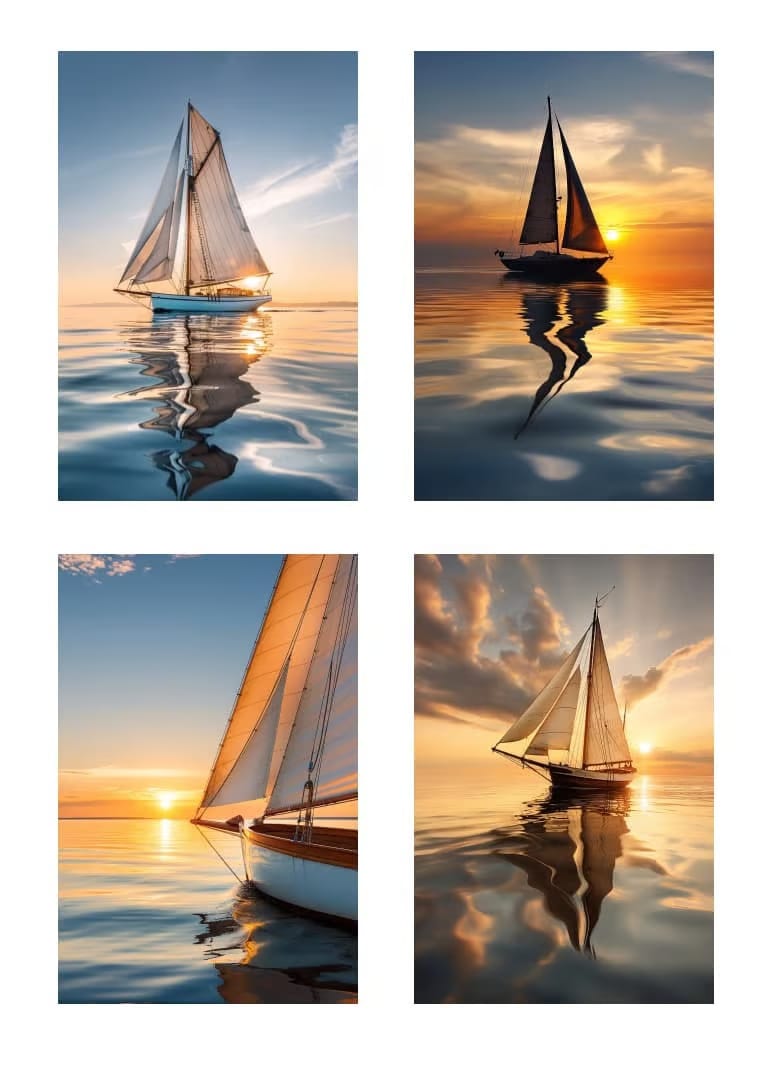 Prompt: Un velero clásico con velas blancas ondeantes navega por aguas tranquilas con el telón de fondo de una encantadora puesta de sol.