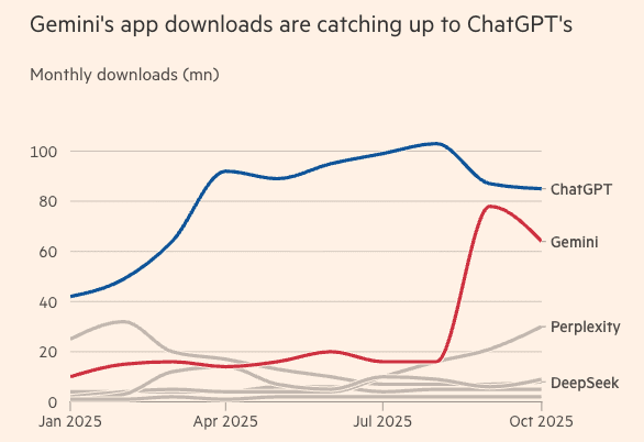 1. Las descargas de la aplicación Gemini están según se informa alcanzando a ChatGPT: ChatGPT sigue siendo el chatbot de IA más popular, con 85 millones de descargas mensuales en octubre. Pero Gemini está acortando distancias con 64 millones de descargas, frente a los 16 millones de agosto. Los usuarios de Gemini también pasan más tiempo chateando que los usuarios de ChatGPT o Claude. La tendencia se debe en gran parte a las capacidades mejoradas de generación de imágenes de Gemini.