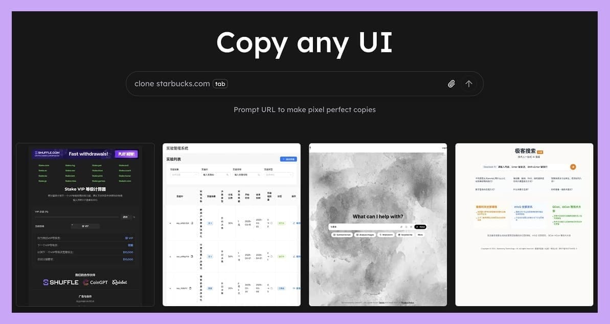 Sube una imagen o añade la URL del sitio web que deseas replicar e introduce un prompt para clonarlo.