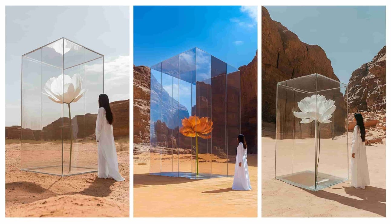 Midjourney Prompt: En el corazón del desierto de Al Ula, se erige un enorme cubo de cristal con una gran flor en su interior, que refleja su entorno y forma una estructura única en perfecta armonía con la naturaleza. La instalación ha sido diseñada por el renombrado arquitecto Tadao Ando para crear una experiencia inmersiva en su interior. Una mujer vestida de blanco se encuentra junto a la caja transparente. Esta cautivadora pieza añade profundidad y dimensión a tu narrativa visual, creando un impresionante telón de fondo para la fotografía o la producción de vídeos. --ar 6:19⭐⭐⭐ Adquiere nuevos clientes y aumenta tus ingresos asociándote con nosotros