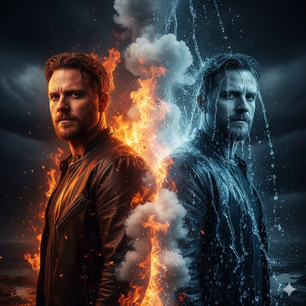 Epic cinematic hyper-realistic portrait of two identical men (attached photo), standing back to back in perfect symmetry. The man on the left is engulfed in roaring flames, glowing embers swirling around his scorched leather jacket, illuminated by fiery orange light. The man on the right is drenched in cascading water, droplets flowing across his face and soaked jacket, glowing with icy blue tones. At the center where their backs meet, fire and water violently collide, creating a dramatic explosion of steam, sparks, and splashing droplets. Both look intense and unyielding, symbolizing the eternal clash of heat and cold. Ultra-detailed skin textures, realistic elemental effects, cinematic 8K portrait photography with dramatic lighting contrast.