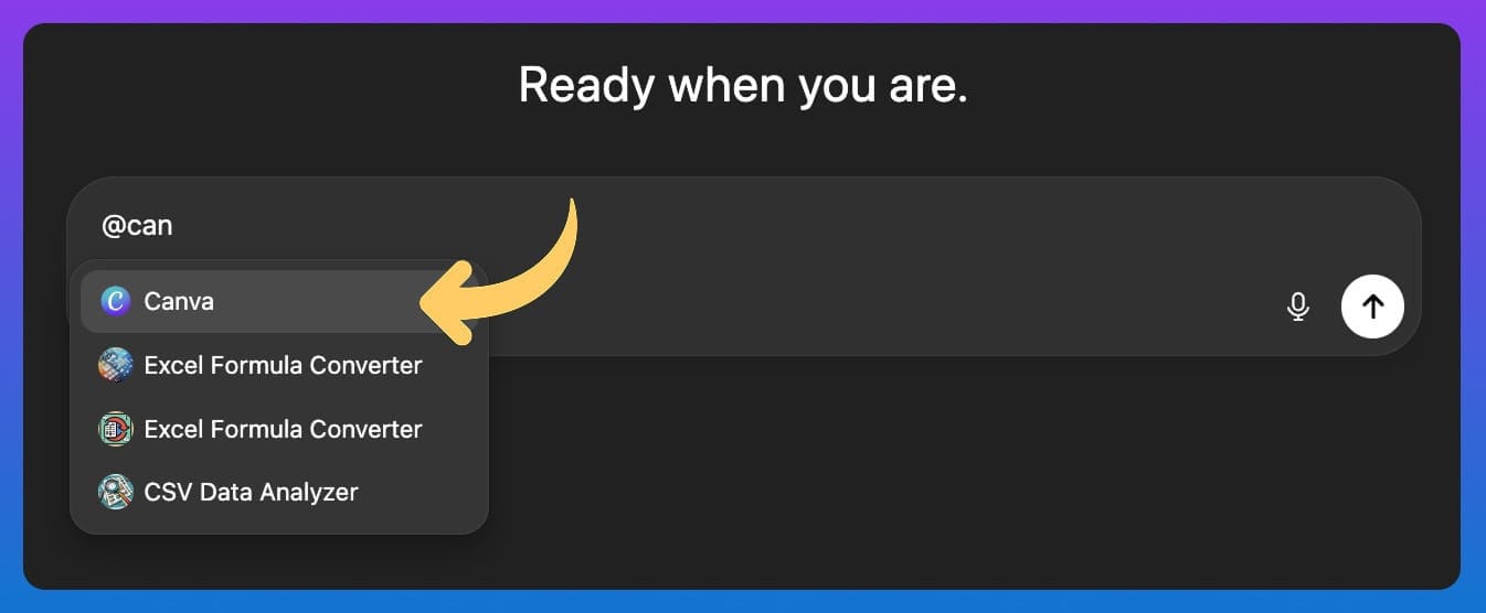 Entra a ChatGPT, escribe “@canva” y selecciona el plugin.