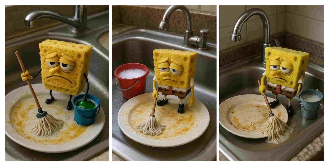 ChatGPT Prompt : Una esponja de verdad con pantalones y la cara de Bob Esponja está de pie con una fregona y un cubo de detergente sobre un plato sucio. Todo esto está en el fregadero. Se ve el grifo y parte de la encimera. Bob Esponja está lavando el plato con una fregona y tiene cara de cansancio, como si fuera a dejarlo.⭐⭐⭐ Adquiere nuevos clientes y aumenta tus ingresos asociándote con nosotros