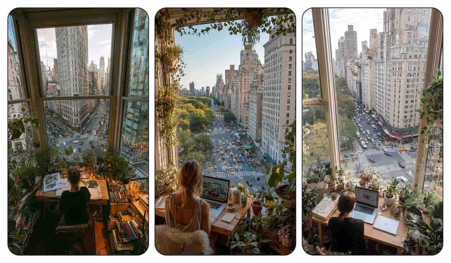 Midjourney Prompt :Una foto de un artista trabajando en tu escritorio en una esquina, con vistas a los edificios y las concurridas calles desde el interior de tu lujoso apartamento en Manhattan Street, Nueva York, rodeado de plantas, materiales artísticos y libros, con un gran ventanal que muestra el tráfico y los altos rascacielos del exterior. La vista es panorámica y captura las tres plantas del edificio visibles a través de las ventanas de cristal. Es última hora de la tarde y la habitación está iluminada con una cálida luz. --ar 85:128 --v 7⭐⭐⭐ Adquiere nuevos clientes y aumenta tus ingresos asociándote con nosotros