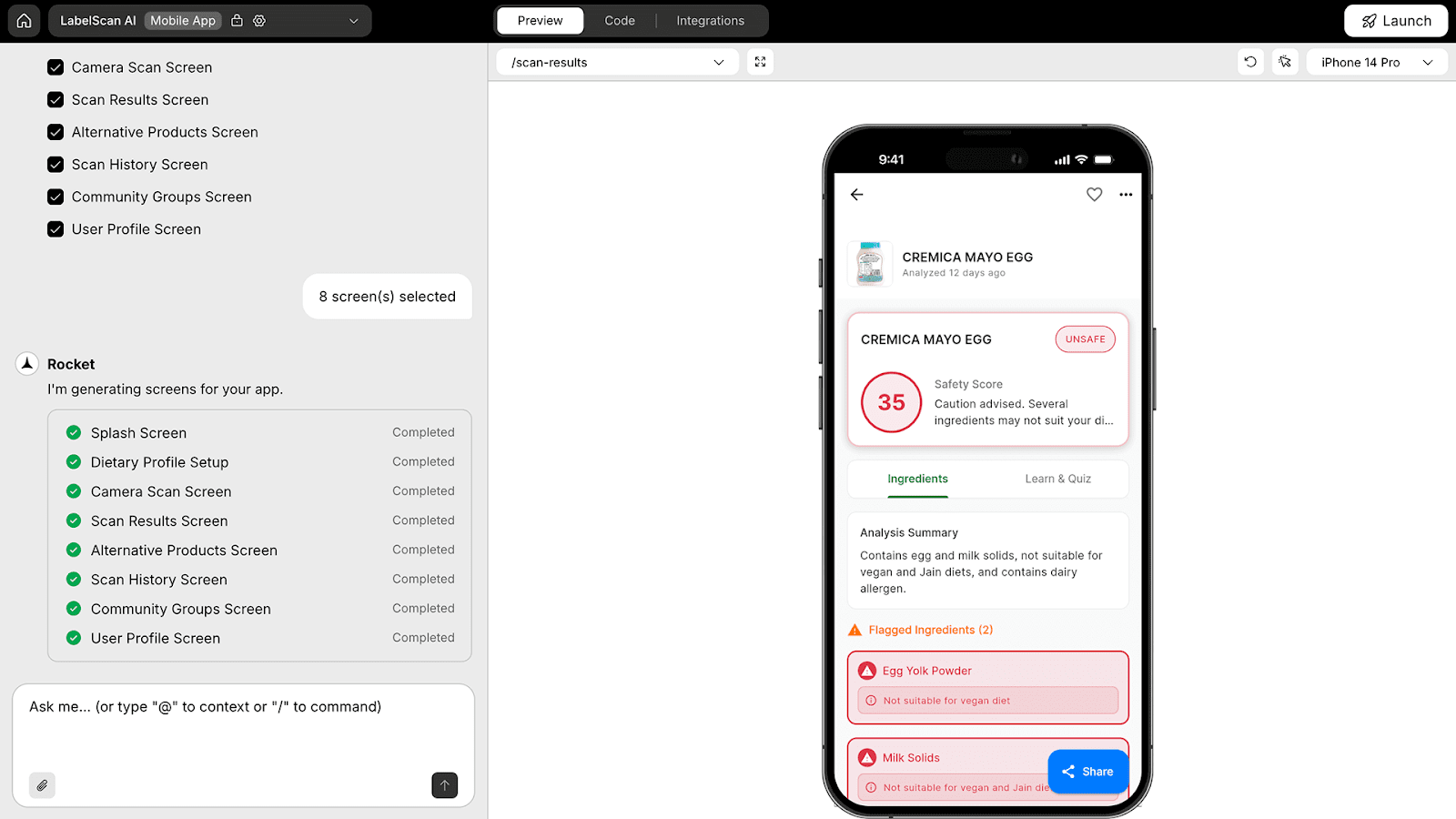 Ejemplo de prompt: «Crea una aplicación nativa de IA llamada LabelScan que permita a los usuarios fotografiar o cargar la etiqueta de un alimento o producto y obtener al instante información específica sobre dietas veganas, jainistas, cetogénicas, diabéticas y alergias. Descifra los ingredientes ocultos, señala riesgos como la leche, los cacahuetes, el gluten, la gelatina, los aditivos E y los azúcares añadidos, los explica en un lenguaje sencillo y sugiere alternativas más seguras».Elige un caso de uso: aplicación móvil, aplicación web, panel de control, herramienta interna, sitio web o página de destino.